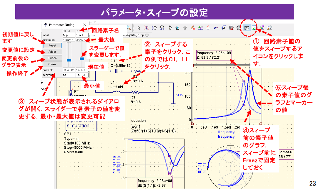この機能により,従来手動で試行錯誤を繰り返していたプロセスを大幅に効率化できます.また,部品値の変さらに応じて自動的に生成される特性グラフは,視覚的にも理解しやすく設計されています.