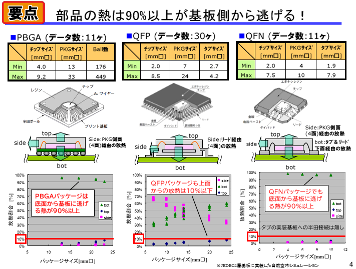 放熱割合はPBGA,QFP,QFNで異なるものの,いずれも90$%$以上が基板側へ逃げる点は共通しています.基板の層構成や配線,実装密度に応じて放熱経路を理解することで,ICの信頼性と寿命を確保できます.