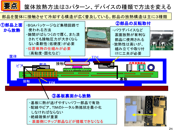 図1 筐体を熱経路として活用する方法が広く用いられている.放熱経路は部品上面,基板裏面,部品の反転取付の3種類.画像クリックで動画を見る.または記事を読む.[著]国峯尚樹