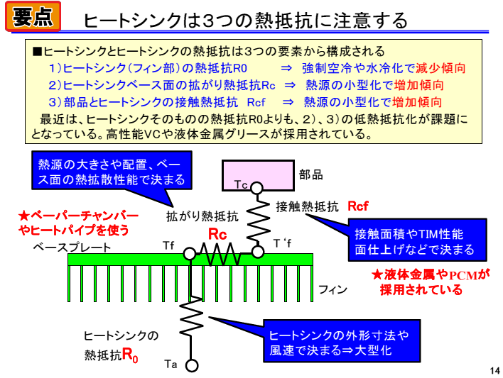 従来はヒートシンク本体の熱抵抗$R_0$を低減することが中心でしたが,近年は熱源の小型化により$R_c$や $R_{cf}$の影響が支配的になっています.そこでベーパーチャンバ,ヒートパイプ,液体金属グリースなどの高性能な熱伝導部材が使われるようになっています.