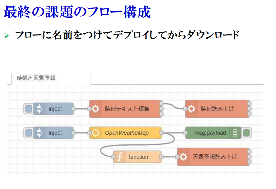 図1 Node-REDのexecノードやラズパイ向け音声合成エンジン AquestalkPiを使って,時刻と天気予報を音声で読み上げるIoTデバイスをスピード制作.画像クリックで動画を見る.または記事を読む.[提供・著]後閑 哲也 詳細:[VOD/Pi KIT]ラズパイ×Node-REDで作ろう!IoTアプリ開発入門 |