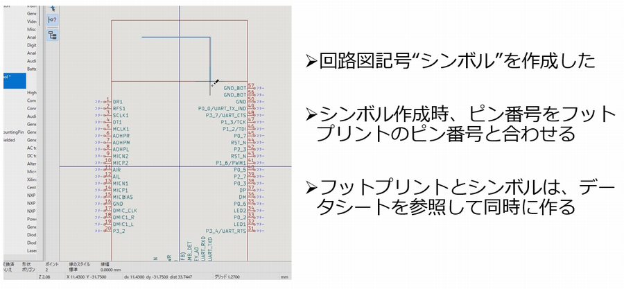 図1 シンボル作成の要点は,端子の正確な配置とパッド番号の整合.端子の多い部品は,整理された配置が回路図の可読性に直結するので,ライブラリ管理とシンボル設計を正確に行いたい.画像クリックで動画を見る.または記事を読む.[提供・著]善養寺 薫(ディスクリテック) 詳細:動画で1日マスタ! プリント基板KiCad教科書 |