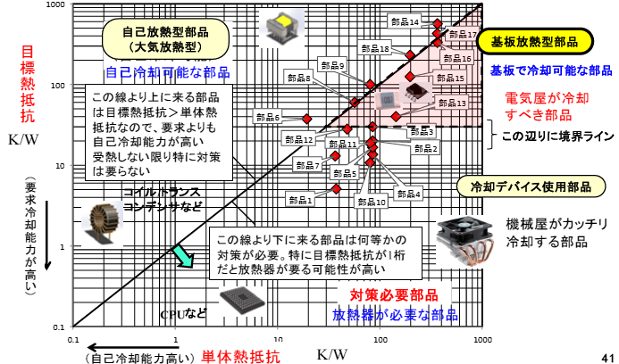 電子部品の放熱対策を適切に行うためには,熱抵抗の観点から部品を分類することが重要です.部品ごとの消費電力,表面積,熱流束,単体熱抵抗を計算し,目標熱抵抗と比較することで,どのような対策が必要かを判断できます.