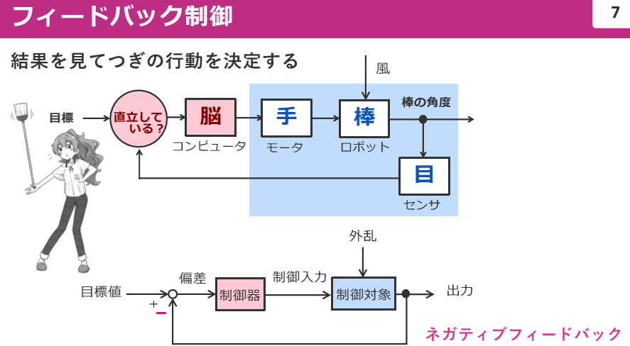 棒を手で直立させる「倒立振子」の制御を考えます.制御対象は棒,目標状態は直立した姿勢です.棒の傾き角度をセンサで測定し,その値が目標値(直立)からどれだけずれているかを計算します.その偏差に基づき,モータが動き,棒を適切な方向に補正します.この一連の流れは,ロボット制御でも共通する重要な考え方です.