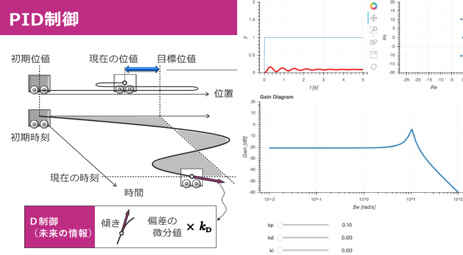 D制御(微分制御)は,誤差の時間変化に基づいて制御量を決定する手法です.これにより,制御系の応答速度や過渡特性を改善できます.