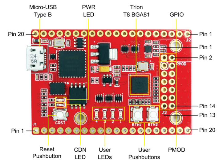 Xyloniには,USBコネクタ,ユーザ用ボタン,LED,SDカード・スロットといった実用的なI/Oが実装されています.制御信号はTrion T8 FPGAに直結しており,ユーザ・ロジックから自由に制御できます.また,33.33MHzのクロック発振器が搭載されており,内部PLLで周波数を自在に変更できます.