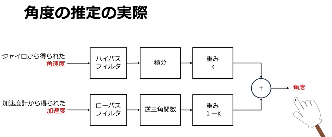 加速度センサは重力に対する角度を測定しますが,ノイズが多く,外部の振動や加速変化に弱い性質があります.センサ・フュージョンは,これらのセンサから得られる信号に重みをもたせ,最適な割合で合成することで信号の精度を高めます.