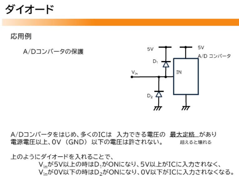 アナログやディジタルのICは,入力電圧の範囲が電源電圧から0Vまでに制限されていることが多いです.入力端子に過大な電圧が加わると,内部のトランジスタが破壊されることがあります.そのため,多くのICでは入力端子の内部に2つの保護ダイオードが組み込まれています.これらのダイオードは,入力電圧が規定範囲を超えた際に,電流を電源ラインまたはグラウンドへ逃がす働きをします.