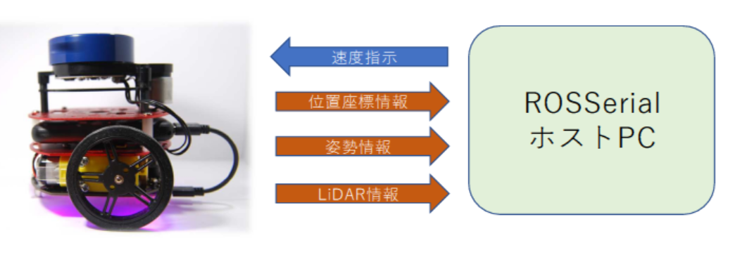 ROS(Robot Operating System)は,ロボット開発のためのオープンソース・ミドルウェアであり,多様なセンサやアクチュエータとの統合が容易です.この実験用SLAMロボットはWi-Fiクライアントとして機能し,IMUセンサ情報をROSホストへ送信して,動的な位置推定と地図生成を実現します.