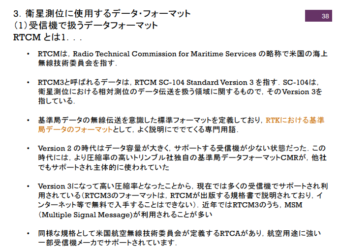 RTCMは「Radio Technical Commission for Maritime Services」の略で,米国の海上無線技術委員会により策定された通信規格です.特にRTCM Version 3は,衛星測位システムで用いる基準局から移動局への高精度なデータ配信に適しています.以前のVersion 2は圧縮率が低く,通信負荷が高いことから,トリンブル社が開発したCMRという独自フォーマットが広く使われていました.