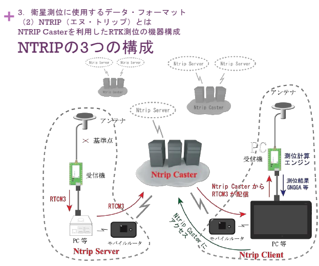 - NTRIP Server(サーバ):基準局に設置され,GNSS受信機で観測した測位データを生成し,NTRIP Casterへ送信