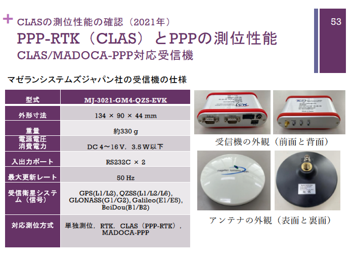 2021年,マゼランシステムズジャパン社のCLAS対応受信機を用いて定点および移動観測が行われました.オープン・スカイの環境下では,CLASによる測位精度は水平RMSで36mmを記録し,Fix率も100%という良好な結果が得られました.
