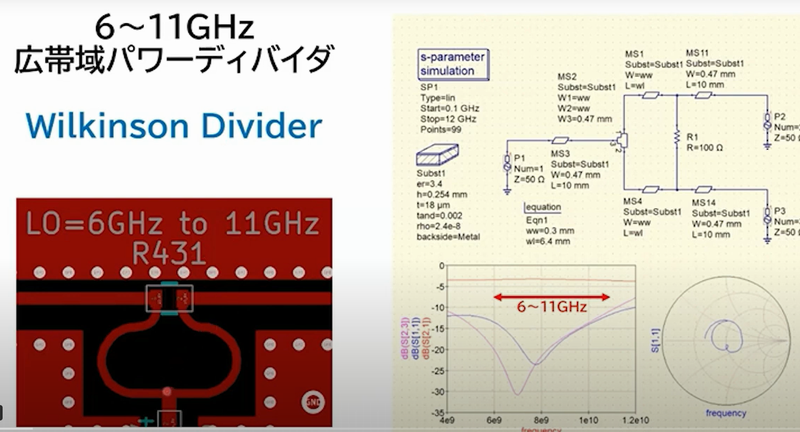 ウィルキンソン・ディバイダは,マイクロ波回路において信号を2つに分配するための基本的な構成です.構成はシンプルで,マイクロストリップ線路と1本の100$Omega$チップ抵抗からなります.この構造により,ロスレスに近い動作が可能です.