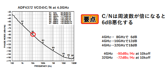 実際の例として,4GHz帯で使用されるVCOのC/Nを考えます.VCOは基準となる値をもち,一般的に10kHz付近のオフセット周波数で評価されます.ここで示されるC/Nは-90dBc/Hz程度ですが,この値は基本的に4GHz用のスペックです.ミリ波帯での高周波に適用すると,倍々に周波数が上がるごとにC/Nは6dBずつ悪化していきます.つまり,8GHzでは4GHzに比べ6dB悪化し,16GHzではさらに12dB,32GHzでは18dBの悪化になります.