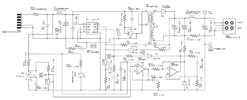 図1 USB電源供給下での安全性と低リプル化を重視し,ポリスイッチやLCフィルタを用いて安定した出力を実現するフライバック・コンバータ設計事例.