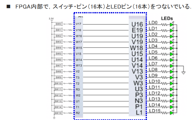 FPGAの内部では,スイッチのピンとLEDのピンをHDL(Hardware Description Language)で記述し,接続を定義します.BASYS 3のHDL記述ファイルでは,Verilog HDLを使用し,assign文を用いてスイッチの信号をLEDへ渡します.