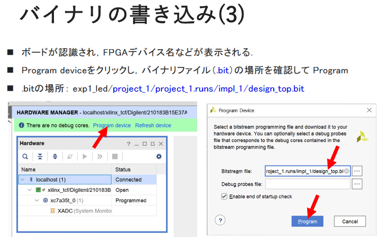 FPGAのプログラムは,回路データをバイナリ・ファイルに変換し,ターゲットボードに転送することで実行されます.Xilinx製のFPGAを使用する場合,以下の手順でバイナリを書き込みます.