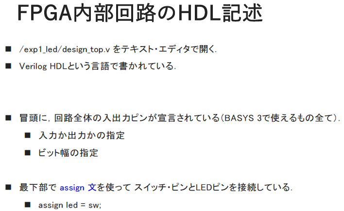この記述により,スイッチの入力信号がLED出力へ直接接続され,スイッチをONにすると対応するLEDが点灯します.