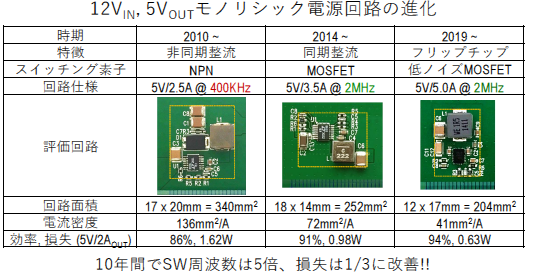 スイッチング周波数は10年前と比較して5倍に向上し,2MHz駆動でもノイズを抑えるゲート駆動技術が導入されています.これにより,AMラジオ帯域外での動作が可能となり,高周波環境下でも安定した性能を発揮します.