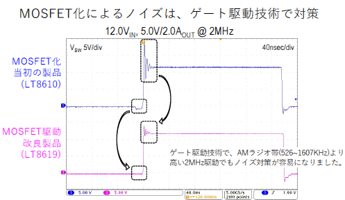 MOSFETを採用した最新のリードレス電源ICでは,ゲート駆動技術によりリンギングを抑制し,低ノイズ動作を実現しています.また,周波数拡散機能を活用することで,伝導ノイズや放射エミッションの低減が可能です.