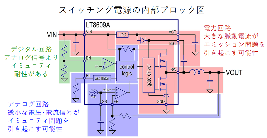 スイッチング電源ICの基板実装では以下の設計要素が重要です