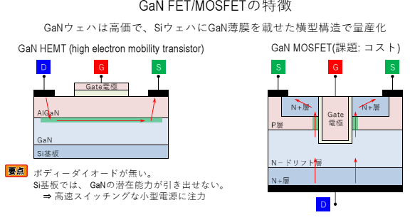 特徴的なのは,GaNトランジスタにはボディ・ダイオードが存在しない点です.シリコンMOSFETでは,スイッチングの際にダイオード動作が必要ですが,GaNではその機能が構造的に省略されており,これが寄生容量の低減に寄与します.結果として,非常に高速なスイッチング特性が得られます.