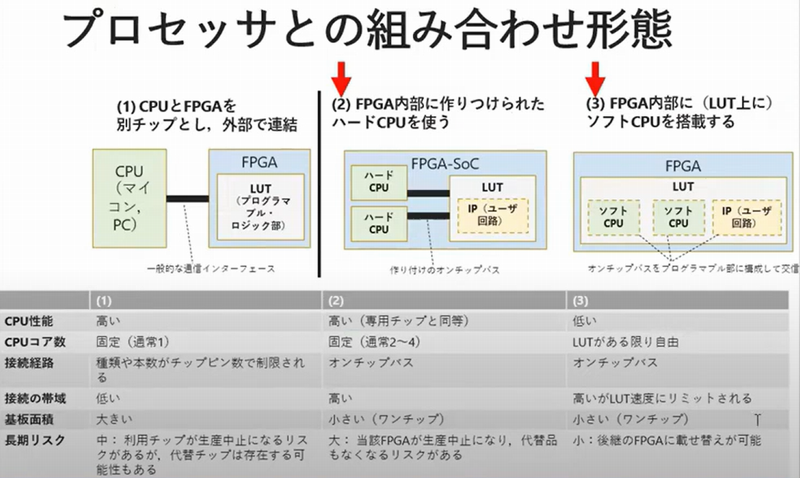 FPGA内部に設計されたハードウェアCPU(e.g., ARM Cortex)を利用 - ソフトCPU構成: FPGA内のLUT(Look-Up Table)上にソフトウェアでCPUを実装