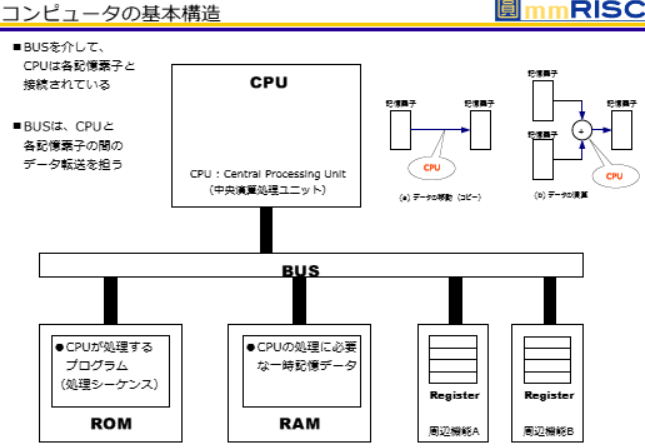 コンピュータの中心にはCPU(Central Processing Unit:中央演算処理ユニット)が存在します。CPUは計算や制御の中心であり、各種記憶素子や周辺機能とデータをやり取りする役割を担います。主な記憶素子にはROM、RAM、レジスターがあります。ROMはプログラムや固定データを格納し、RAMは一時的な作業領域として使用されます。レジスターはCPU内部で高速にアクセスできる小容量の記憶領域です。