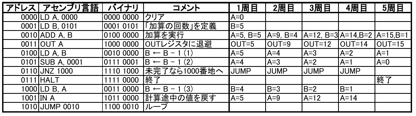 プログラム中でループ処理を行うためには,加算(あるいは減算)の対象となる2つの値を格納するレジスタに加えて,途中の計算結果を格納するレジスタが必要となります.すなわち,合計3つのレジスタを用意する必要があります.“CPU1738”は「Aレジスタ」と「Bレジスタ」の2つしか汎用レジスタを持たないので,ここでは「OUTレジスタ」に計算の途中結果を保存するようにしています.ただし,OUTレジスタの出力はCPU内部から参照できないので,このプログラムを実行するときはOUTポートとINポートをケーブルで接続します.こうすることで,“IN A”命令によってOUTレジスタの内容をAレジスタに読み込むことができます(表4の9番地(1001番地)の処理).