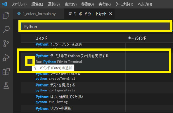 図75の画面が表示されるので,検索欄に“Python”と入力します.Python関係の内容が表示されるので,画面を下にスクロールして「Python: ターミナルで Python ファイルを実行する」という項目を探し,[+] ボタンをクリックします.