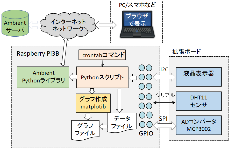 - ラズベリー・パイに各種センサや表示操作機器を接続する方法を学習し,Pythonプログラムでこれらを制御してデータを収集保存,グラフ化するなどしてIoTシステムを構築できることを目標とする