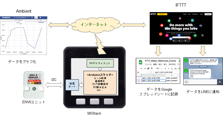 IoTモジュールではインターネットを経由してデータ収集及び可視化を行うことで,取得したデータを場所にとらわれずどこにいても確認することができることも特徴の一つとなります.本セミナではWi-Fi対応マイコンモジュール「M5Stack」シリーズを使って,インターネットでの連携サービスである「IFTTT※」を使ったデータ収集,およびデータ可視化サービスである「Ambient※」によるデータのグラフ化をする方法を解説します.