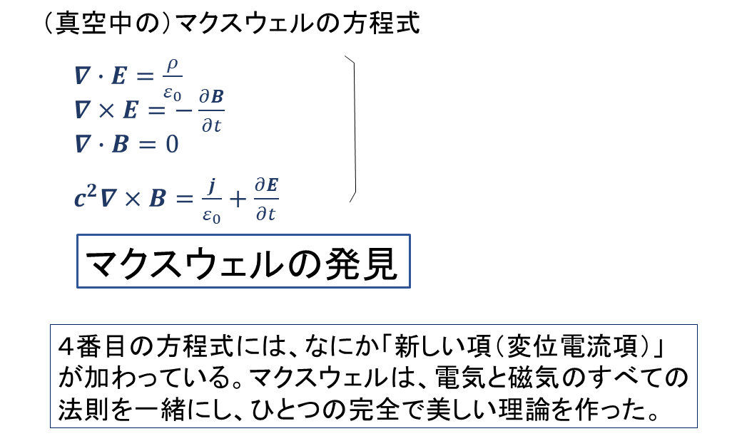 トピックスとして,宇宙論におけるブラックホールの話,そしてクーロンの法則におけるクーロン力の本質について説明します.これらを通して,あらためてマクスウェルの方程式の偉大さを実感していただければ幸いです.