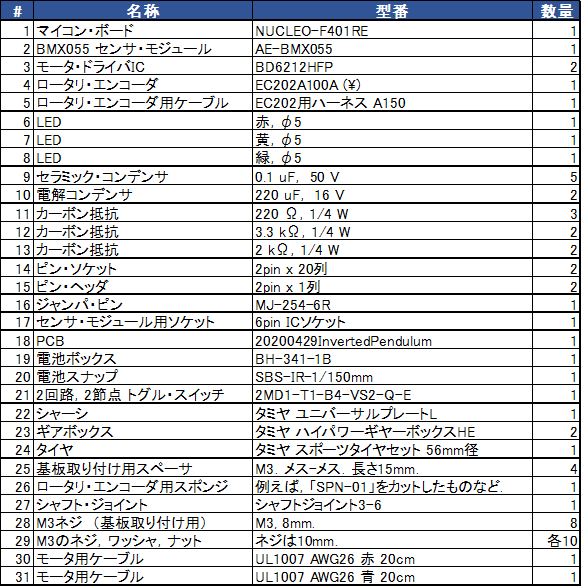 表2: 確率・統計ロボティクス学習キット MZIP-01の部品表