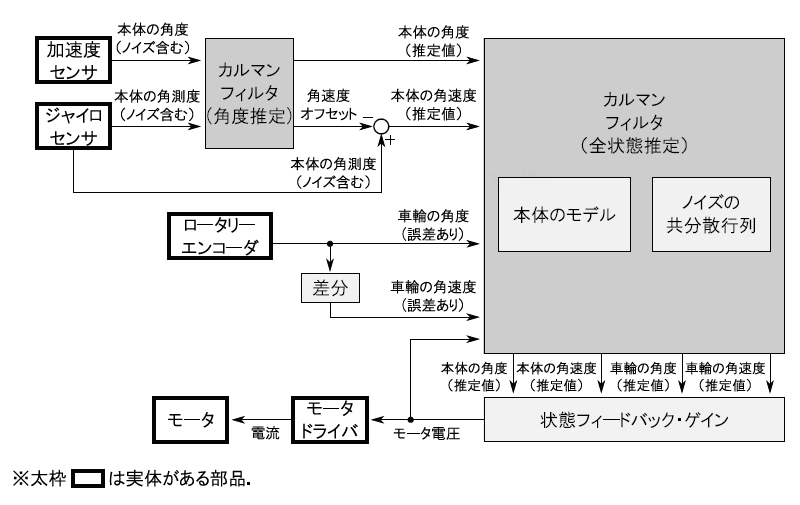 図3に,確率・統計ロボティクス学習キットの全システムを示します.太枠のブロックは実体がある部品を,それ以外はプログラム上の処理を表しています.