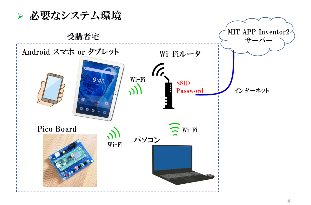 まず,アプリの画面デザイン設計やブロック・プログラミングの基本を学習し,その後,ラズベリー・パイ Pico W を搭載した「スマホ連携IoT実習キット」を使って,LED制御やセンサ計測といったIoTアプリの開発を体験します.