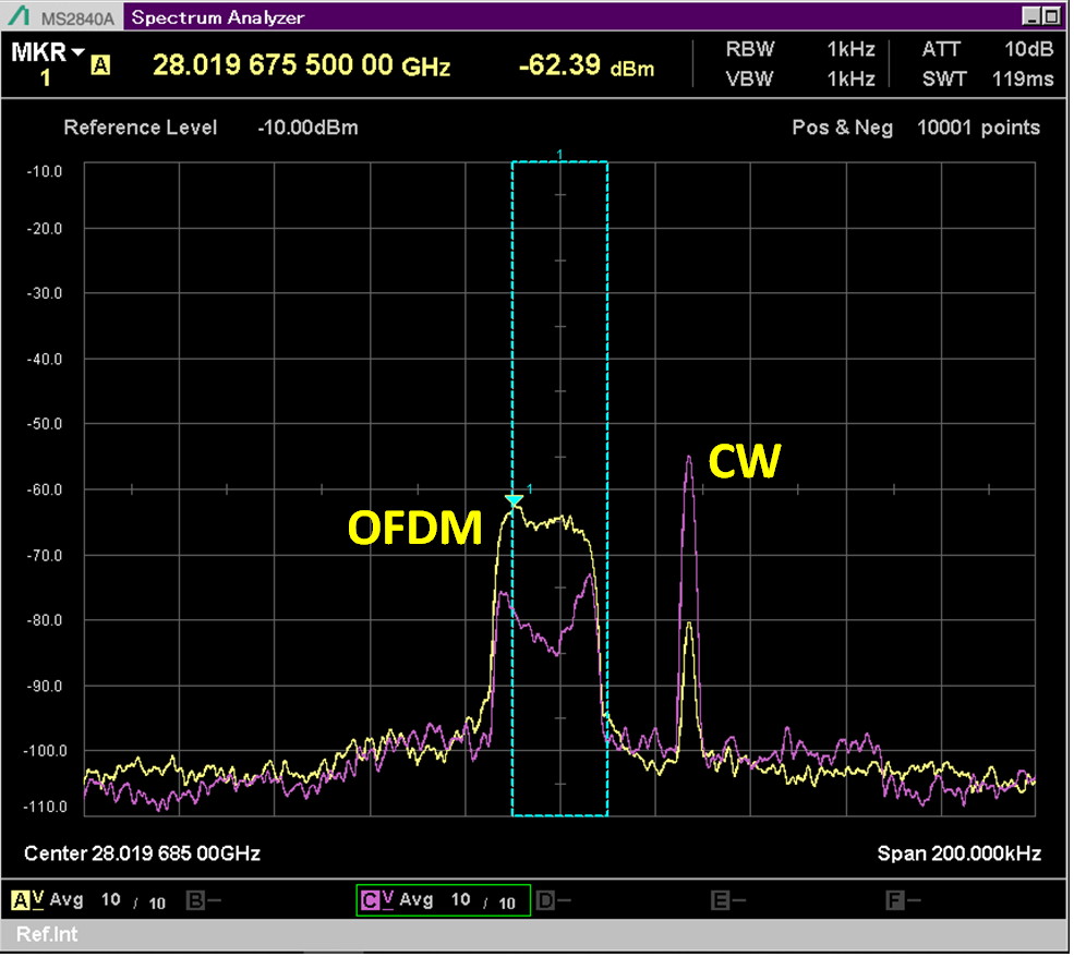 2つのビームは,スペアナの画面上で容易に見分けられるよう,片方をOFDM(Orthogonal Frequency Division Multiplexing),もう片方をCW(Continuous Wave)としています.