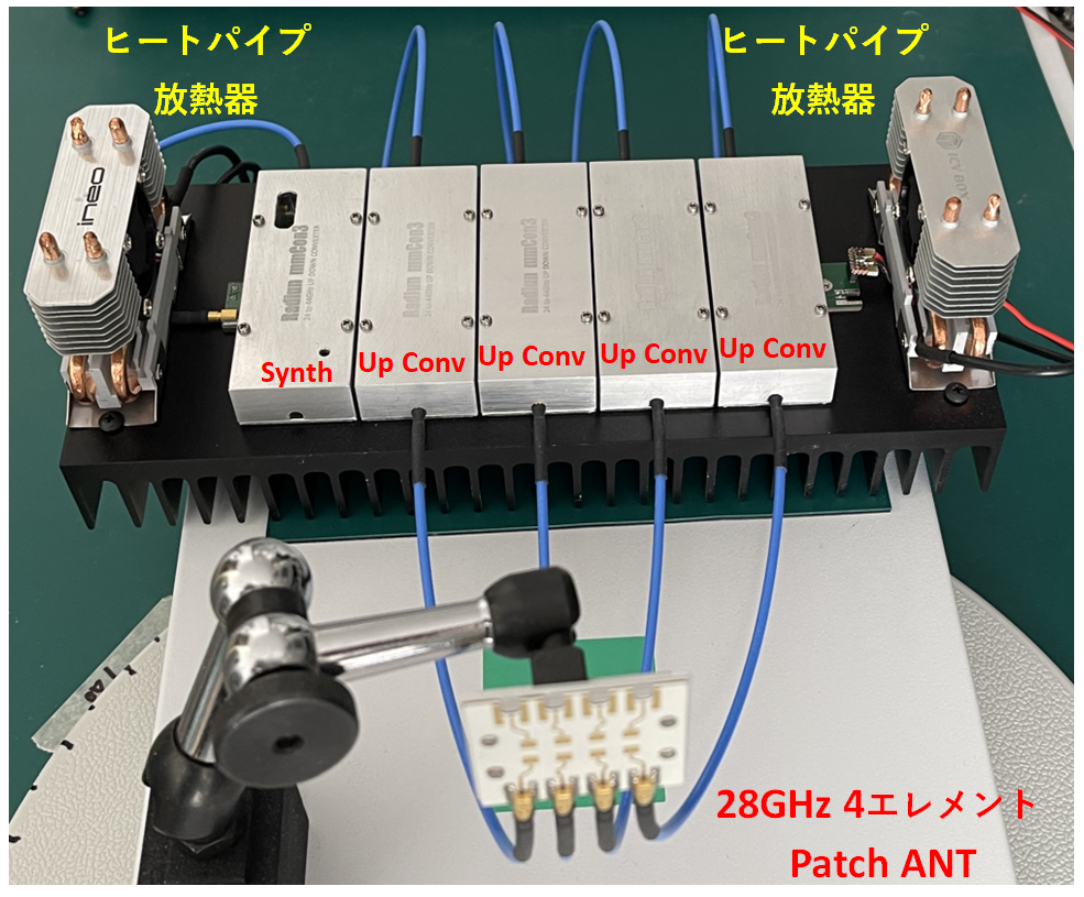 mmant2には,同じエレメントが4つ並べられています.各エレメントにそれぞれ,独立したミリ波アップコンバータ z-mmcon3-txを4個割り当てています.USB SDR“USRP N310”からは,4チャネルの異なる変調信号を生成します.