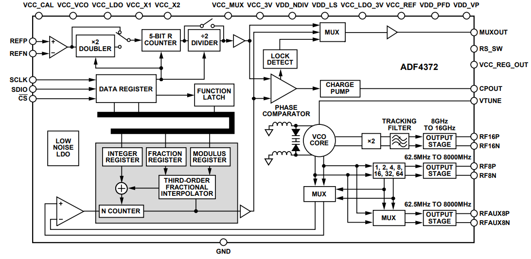 図3 VCO内蔵マイクロ波広帯域シンセサイザ ADF4372の内部ブロック図