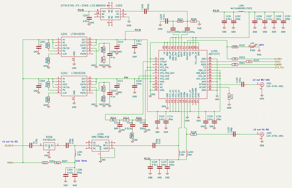 HIバンド(8G~16GHz)のLO信号を出力するSMPM端子,VCO内蔵マイクロ波広帯域シンセサイザ図3),超低雑音LDOレギュレータ LT3045STM32F446マイコン(STマイクロエレクトロニクス),LOバンド(4G~8GHz)のLO信号を出力するSMPM端子を実装しました.