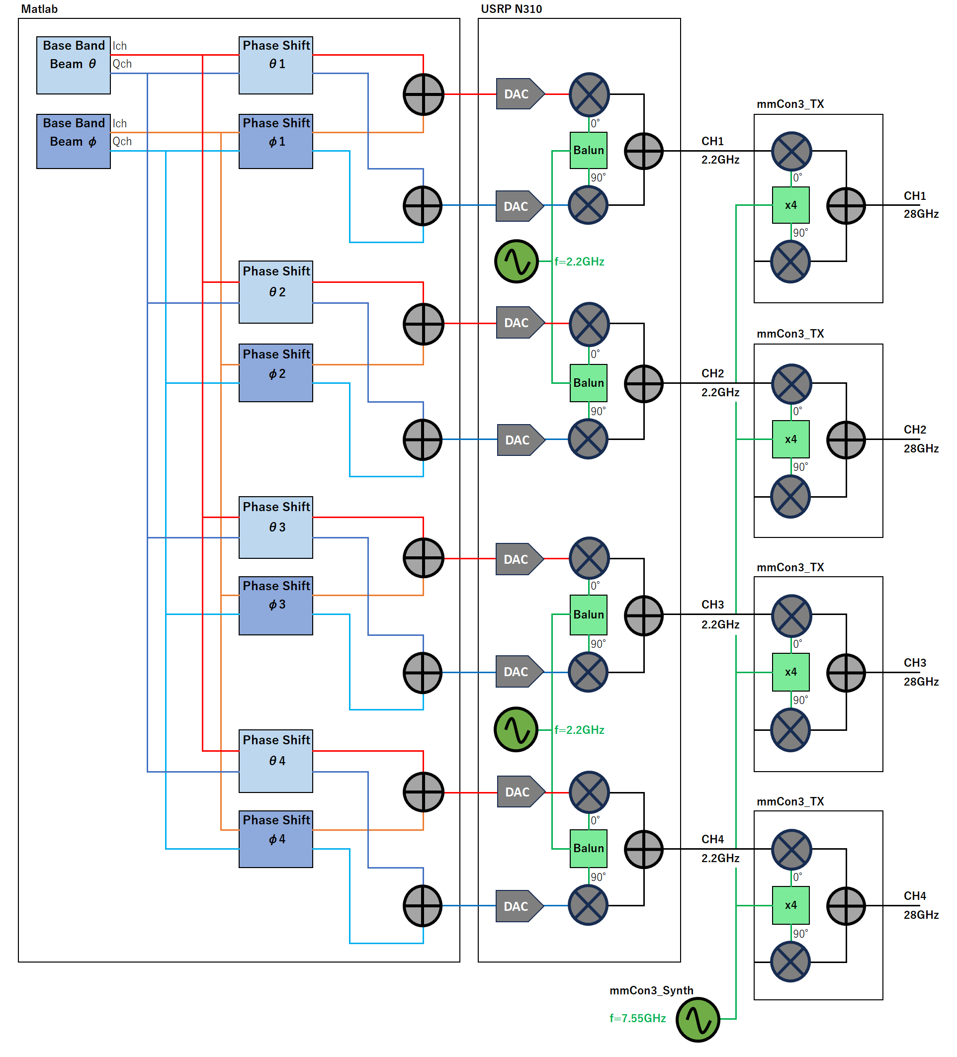 図5 z-mmcon3とUSB SDR USRP N310で構成した実験用マルチビーム・フェーズドアレイ送信器のブロック図