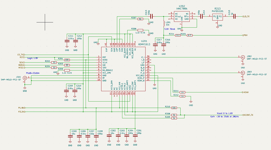 IF I/Q信号を入力するSMPM端子,STM32F446マイコン(STマイクロエレクトロニクス),24G-44GHzワイドバンド・マイクロウェーブ・アップコンバータ ADMV1013(図4),RF出力のSMPM端子が並んでいます.