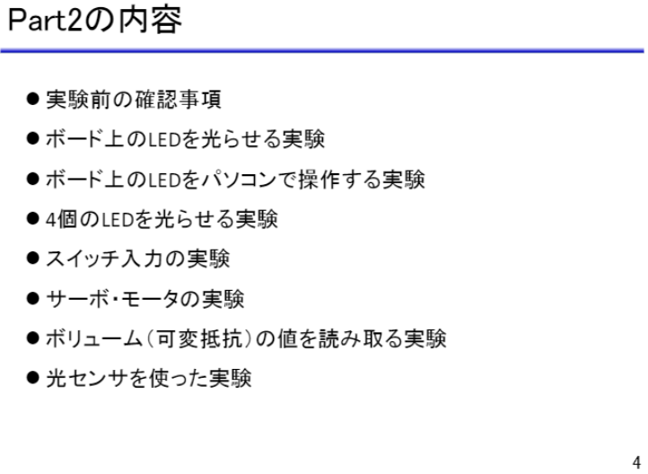 コンピュータやプログラムのしくみを理解し,実習キットを動かしながら,サーボモータやLEDを制御したり,アナログ信号を読み取るPythonプログラミング技術を1日でマスタします.コンピュータやプログラム開発のしくみを解説したのち,サーボモータやLEDを制御したり,アナログ信号を読み取るPythonプログラミングのお手本を示します.