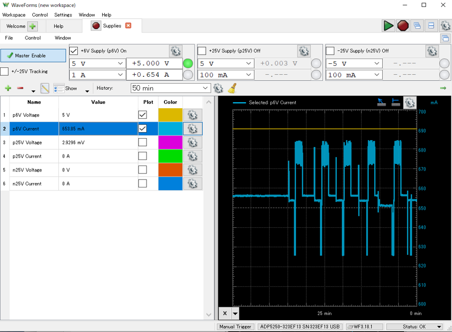 ウォームアップ時の電流変化を観測するために,横軸のスパンを遅め(50分)に設定しています.現在の電圧表示はアクティブなので,横軸のラベルは“V”です.ADP5250が信号処理を始めると,消費電流が増すようすが観測できています.