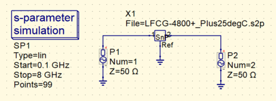 図9に示す2ポートのシミュレーション回路を用意します.次のウェブサイトから表面実装型のチップLPF(LFCG-4800+,ミニサーキッツ製)の$S$パラメータをダウンロードします.