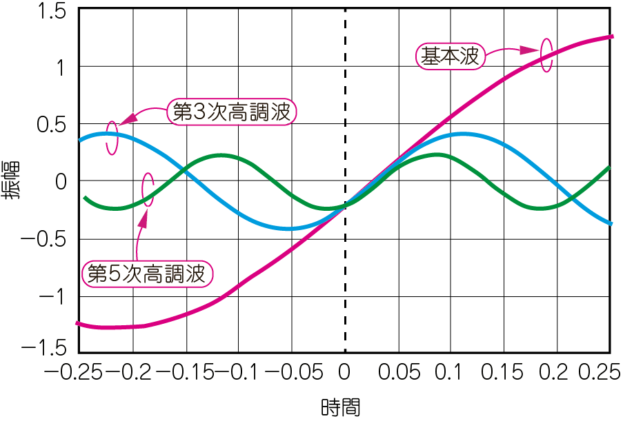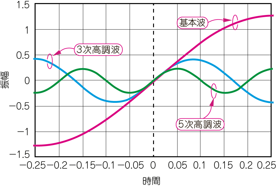 図4(b)に示すのは,この矩形波を構成する単一周波数の正弦波(1次,3次,5次)に分解した波形群です.見やすくするために5次までを表示しました.いずれの波形も,時間0を起点にして変化しており,位相が揃っています.