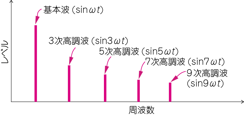 この式は「位相の揃った奇数次高調波を加算すると矩形波になる」と言っています.逆に,矩形波をスペクトルに分解すると,図3のようになります.