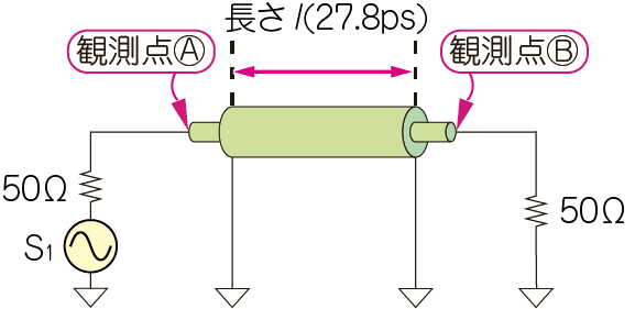 この矩形波を図5に示す伝送路に通します.この伝送路は,送信インピーダンス,受信インピーダンス,そして伝送路の特性インピーダンスはすべて50Ωです.広帯域信号を入力すると,そのまま周波数特性がフラットな状態で通過します.