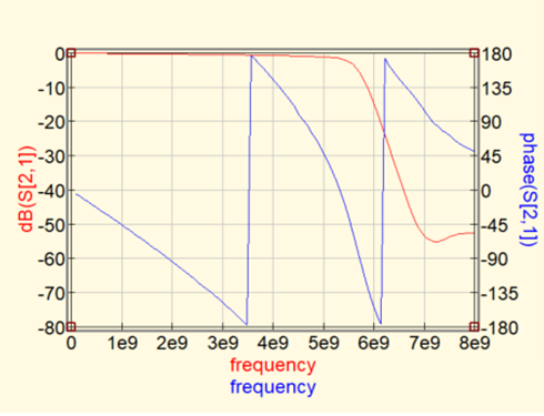 カットオフ周波数(5.5GHz)付近で位相の変化が激しくなり,傾きが急峻になっています.このグラフからは,このLPFがどの周波数まで使えるのかを判断できません.