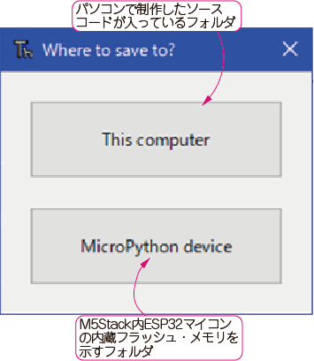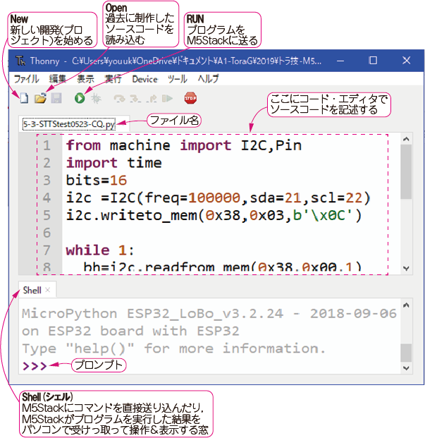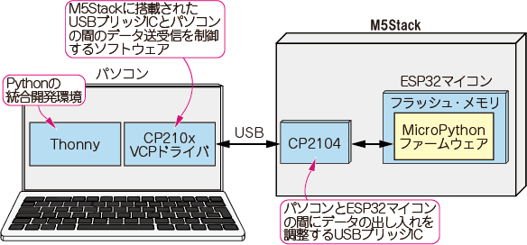 図2に示すのは,M5StackとPython言語を使う対話型開発環境の全体像です.統合開発環境“Thonny”を起動したら,Python言語を使ってソースコードを記述し,M5Stackに転送してプログラムを実行します.
